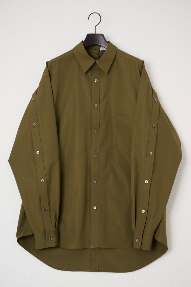 □[UJOH]FULL OPEN SHIRTS “KHAKI” □ 49,500YEN(45,000YEN) □ KHAKI □ SIZE 4 □ COTTON-100% ICONSではUJOHのシンボル的存在の “FULL OPEN SHIRTS” その名の通り、袖、後ろ身頃にもボタン、前たてのディテールを採用し開閉できる仕様になっています。 左右を取り外して 同じシリーズとドッキングも可能なので バイカラーシャツとしての着用も可能です。 ドライタッチなコットントロピカル素材は 皺になりにくく、洗いざらしでの着用も良い雰囲気です。 UJOHを代表するシグネイチャーアイテムの秀逸なパターンをそのまま用いて、素材を変えて製作を行った本作。 アーム部分はボタンが、取り付けられており、開閉可能なデザインになっています。 ボタンを開く事で、振袖のようなオリエンタルなディテールに変化をつけることが可能。 また後ろ身頃の中心が前立てのような仕様になっていて、開閉可能なデザインになっております。幅広い季節でご愛用いただけます。 軽やかな80/2 コットントロピカル素材を用いて、薄手でありながらハリ感も兼ね備え、シワになりにくく、軽やかで滑らかな肌触りが特徴です。 ガス焼きした糸に強撚を加えることで、シャリ感のある独特のタッチとハリを出した生地です。 --------------------------------------------------------------------- 【UJOH】ウジョー デザイナー:西崎暢 東京モード学園卒業後、ヨウジヤマモトに入社。Y’s for men、Yohji Yamamoto pour hommeのパタンナーとして7年間勤務 UJOH(ウジョー)は西崎暢が2009年にスタートしたファッションブランド パタンナーの視点によるクリエーションが特徴で 本質的なテーラーリングや大胆なカッティングなど 布の理にかなったデザインを絶妙なバランスで取り入れている