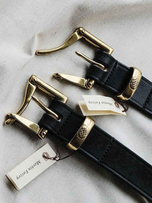□[Martin Feizey]1.25 inch Quick Release Belt □ 27,500YEN (25,000YEN) □ BLACK×PEWTER □ SIZE 30inch / 32inch / 34inch / 36Inch ------------------------------------------------------------- Martin Faizey かつて、イギリスの老舗レザーブランドであるデインズ&ハザウェイのベルト工房で36年活躍していたマーティン・フェイジー氏。 デインズ&ハザウェイ社への商品提供終了のため、自身の名を冠したブランドを英国ウォチェスター州の工房でスタートしたのが、MARTIN FAIZEY (マーティンフェイジー)。 素材にこだわり、英国の高級皮革製品の伝統的なハンドメイドの手法を守り続ける、MARTIN FAIZEY (マーティンフェイジー)は、トップレベルの製品を提供する長く愛されるブランドです。 ------------------------------------------------------------- □ [Martin Feizey] Quick Release Belt 1.25 inch □ 27,500YEN (25,000YEN) □ BLACK×BRASS □ SIZE 30inch / 32inch / 34inch / 34inch 当店のオープン時から変わらず展開する、看板アイテムの一つであり、まさに欠かせないマスターピース。 英国最古 Daines&Hathawayの時代から 現在のMartinFaizeyとしての現在まで。 イギリスの伝統を守り制作されるクラフトマンシップの塊のようなハンドメイドレザーベルト。変わらぬ職人の確かな技術と情熱、 蝋引きされた一枚革、ブライドルレザー。 歴史を紐解けば、馬車の時代、馬具に用いられた、高い強度を誇るレザー。 質実剛健、高い耐久性を誇り、伝統を守り、一本一本手間をかけて製作されます。 そして、真鍮製のバックル。 その特徴的な形状にファンが多いのですが、驚かされるのは、クイックリリースと呼ばれる、 ワンタッチ、ワンアクションで、ベルトを外せる仕様。 ビクトリア時代の消防で使用されたワンタッチバックルをベルトに採用した最古のブランドとされています。 ベルト部の革の経年変化と共に、真鍮独特の味わいの変化も楽しんでいただけます。 裏には Martin Faizeyのハンドメイドを証明する刻印が。 良い物=本物 と、呼べるものを、大切に慈しみ使う。 手入れをして手をかければかけるほど、愛着が湧くはずです。 バイヤーの浅野の私物は A-nut はICONSの開店時に購入し、19年目を迎えます。 二本目に購入したBLK/BRASSは本町移転したタイミングで購入しましたがこちらも14年目を迎えます。 ICONSの品揃えとして、常々考えている 『良いものを長く使う』ことで そのアイテムを身に着けていた時の思い出や出来事も記憶されたり 経年変化での愛着が湧いてきたりと 流行のものを身につけることとの差別化を図ることができるアイテムだと思っております。 ICONSのアイデンティティの一部と言える クイックリリースベルト、ぜひお試しくださいませ。
