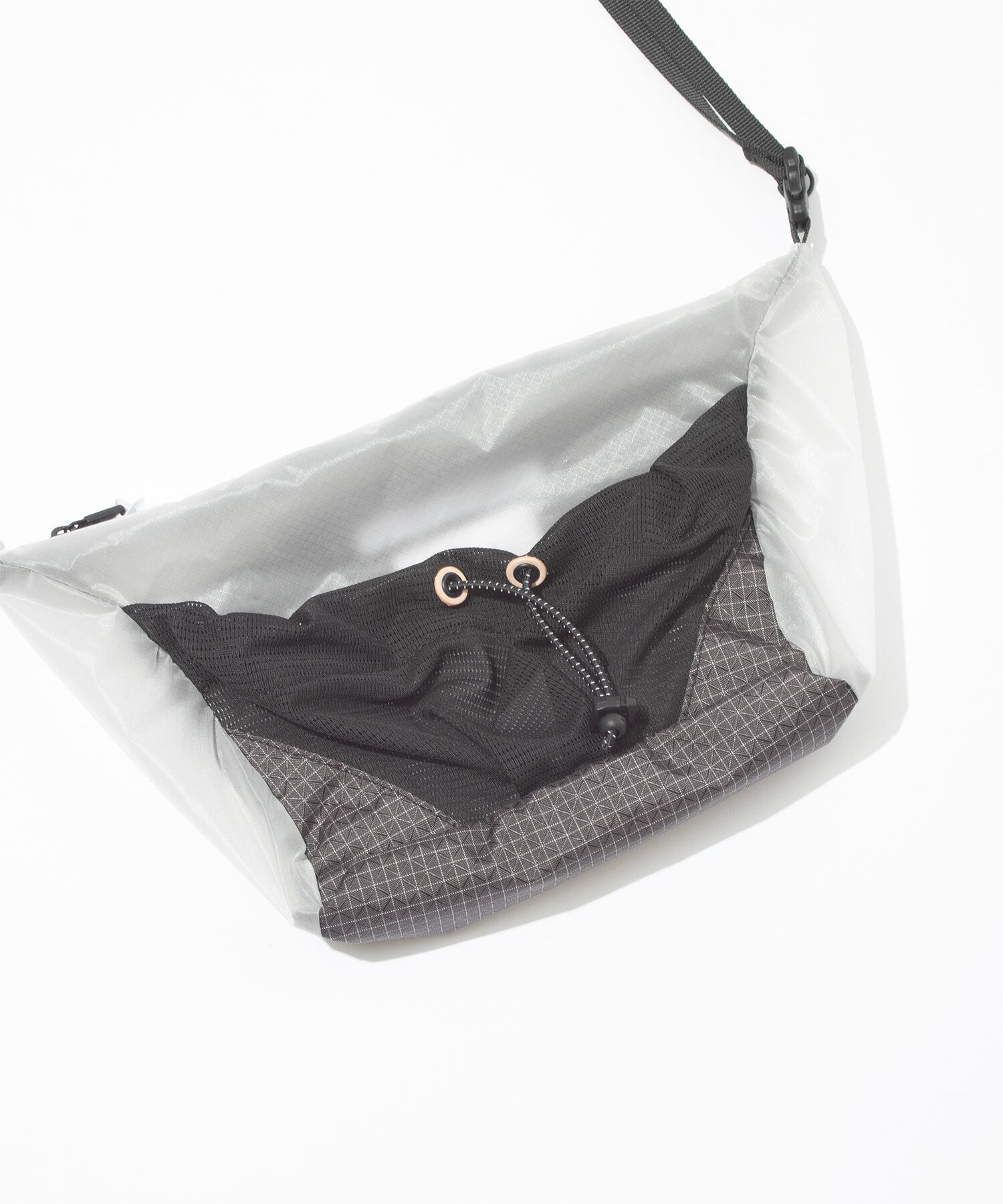 オーセンテックな、スモールサイズの CORDURAシリコンナイロン素材のショルダーバッグ。フロントにはストレッチメッシュを採用。