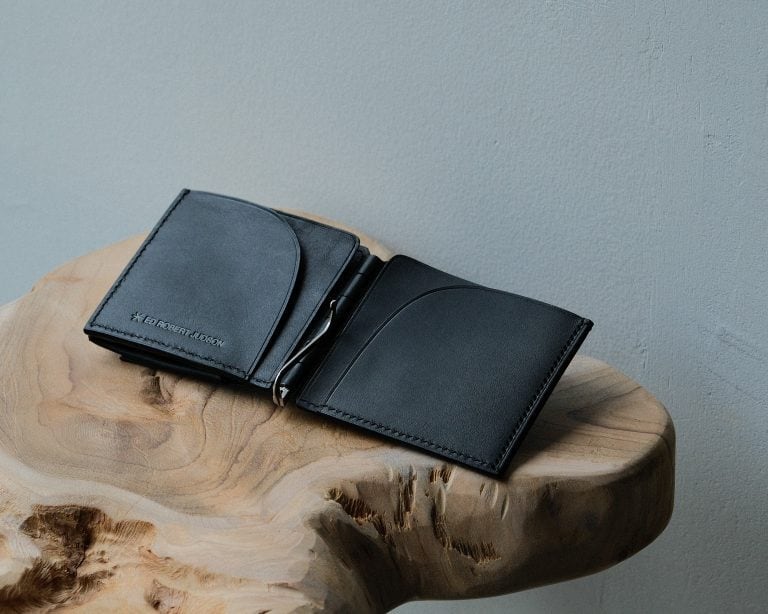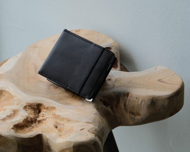 財布の可動部分にドアなどに使われる蝶番の仕組みを取り入れた、マネークリップ式ミニウォレットです。