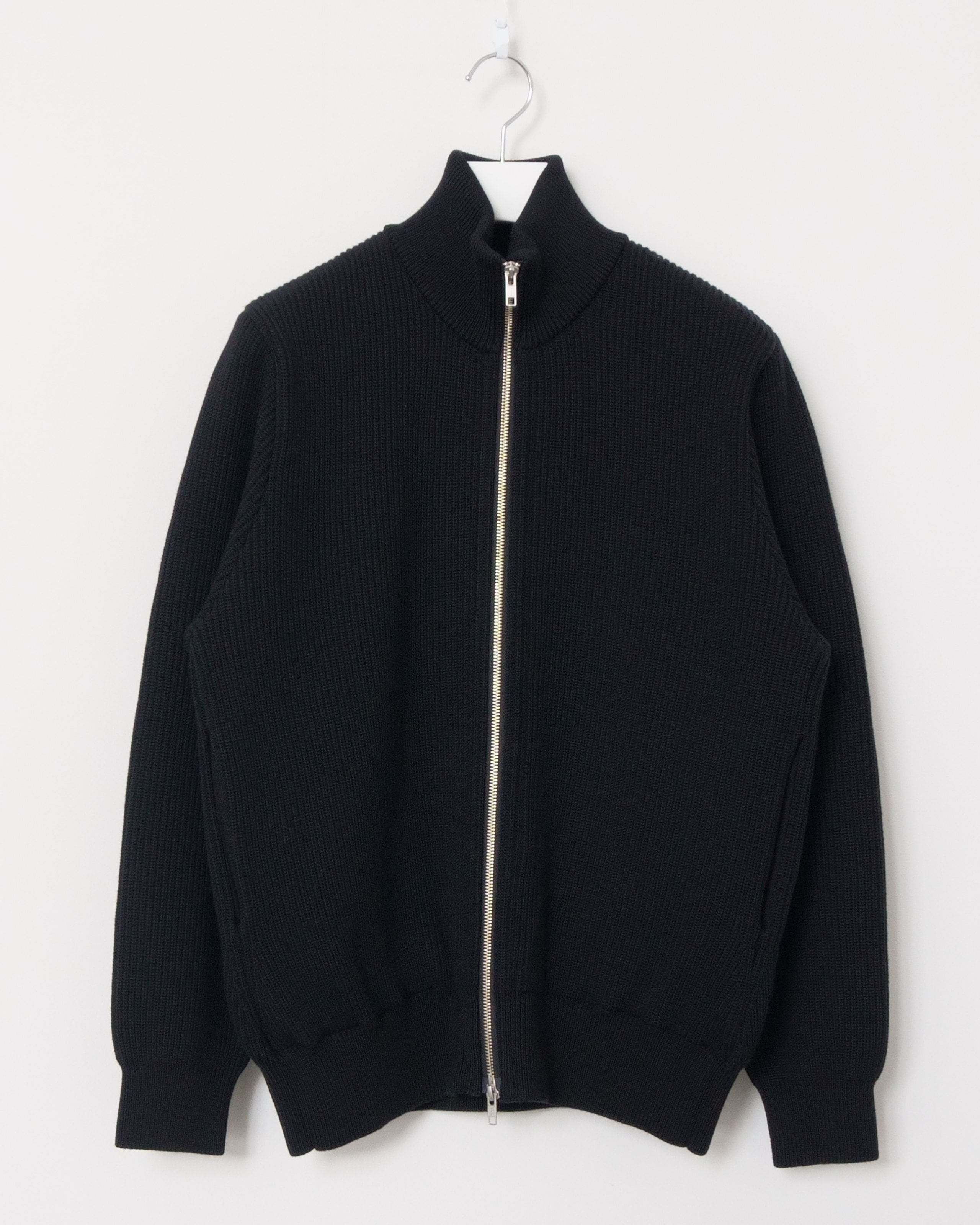 シルクのような光沢とカシミヤのような滑らかな肌触りを持つ高級ウールを、しっかりと編み込んだ畦編みのニットブルゾン。