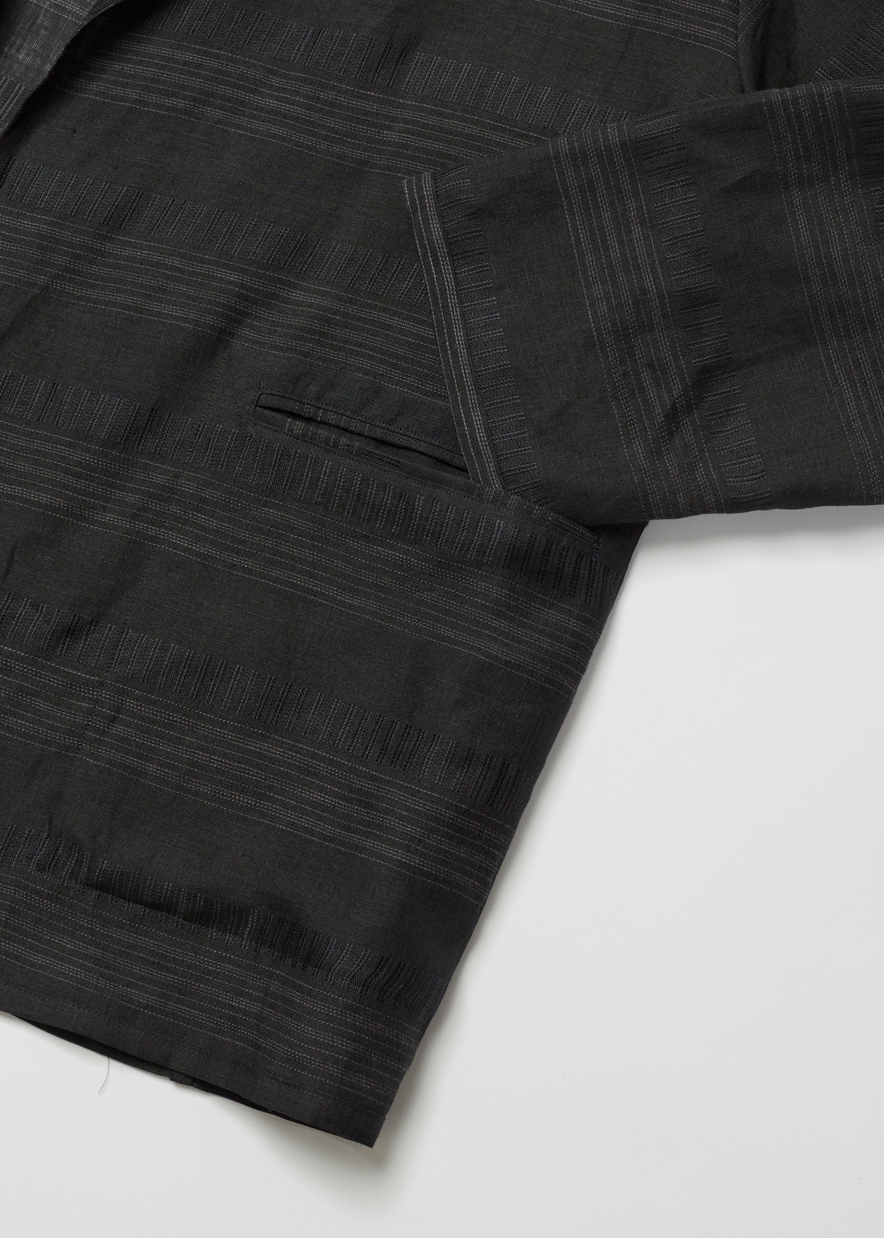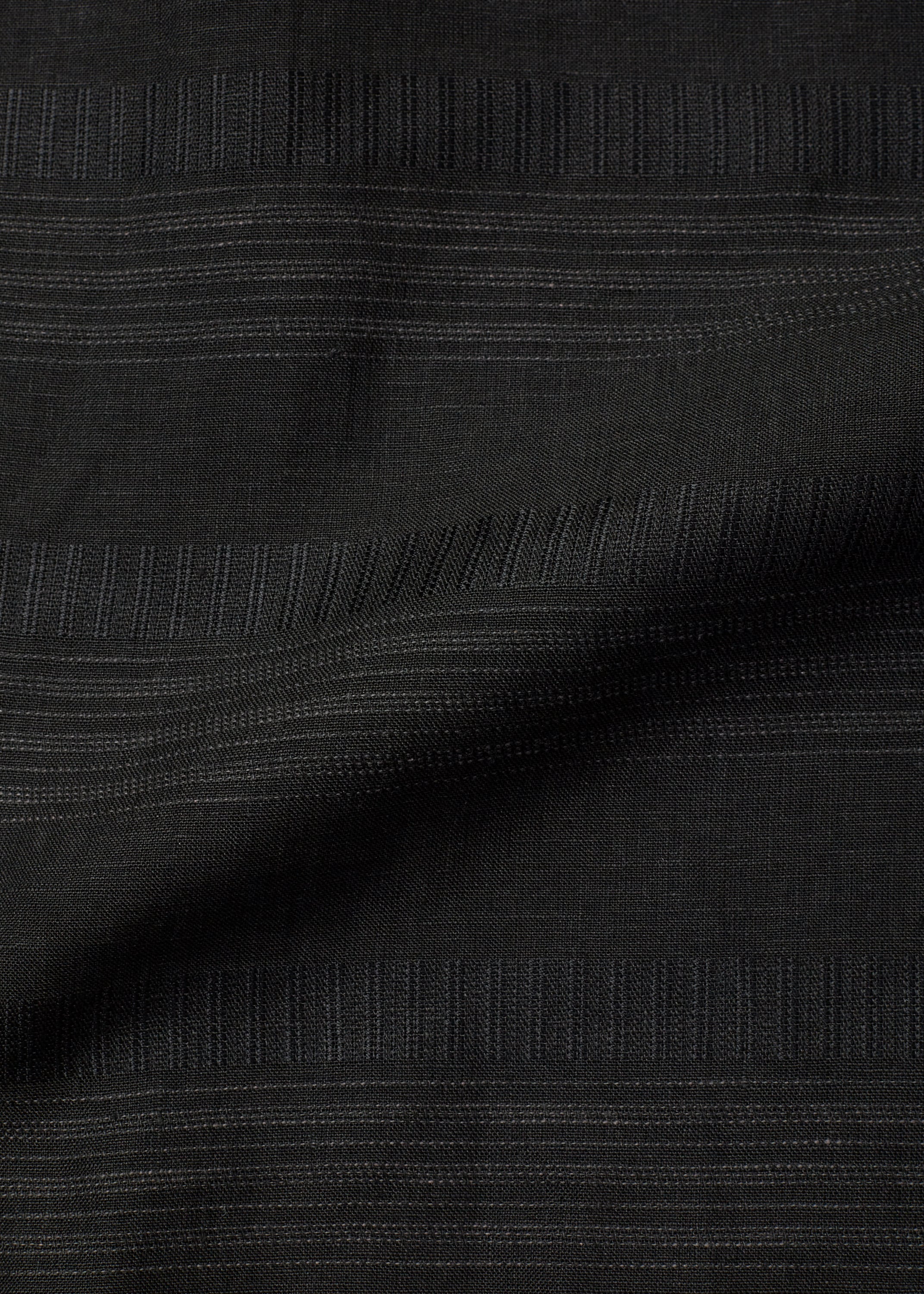 リネン特有のハリのある質感と清涼感を活かしながら、光沢のある柄は同色のキュプラ、立体感のあるラインはコットンを使用した奥行きのある柄が特徴です。