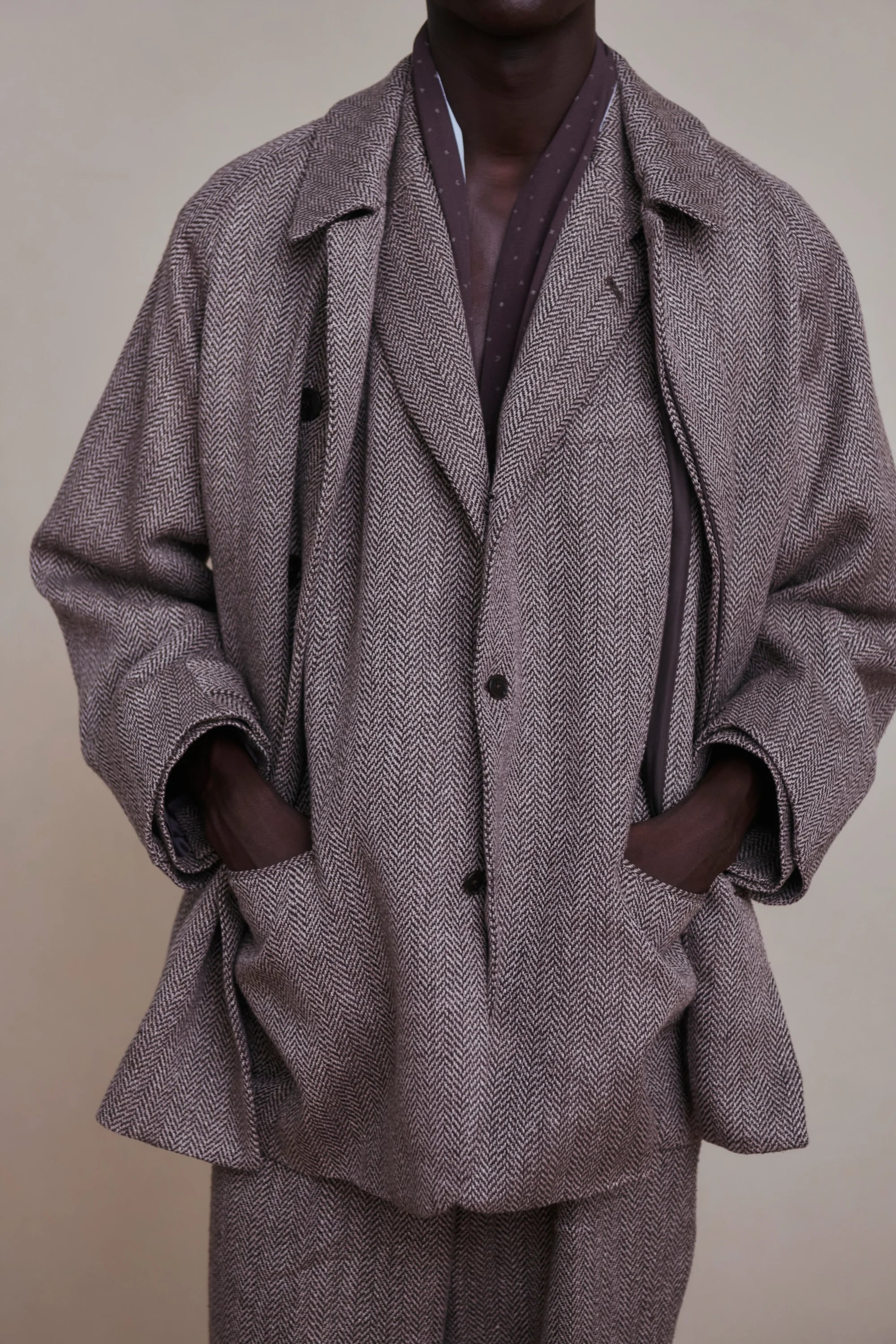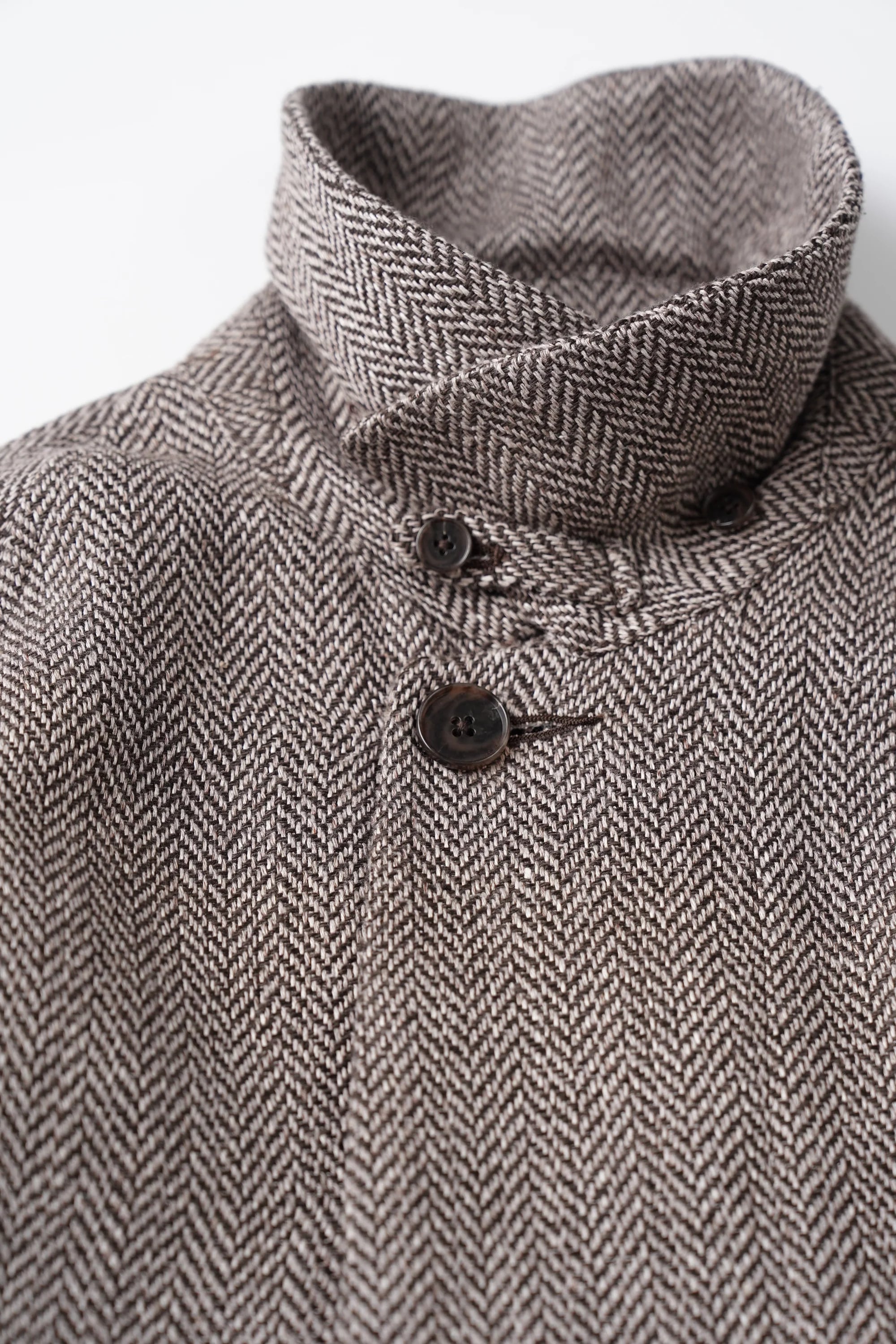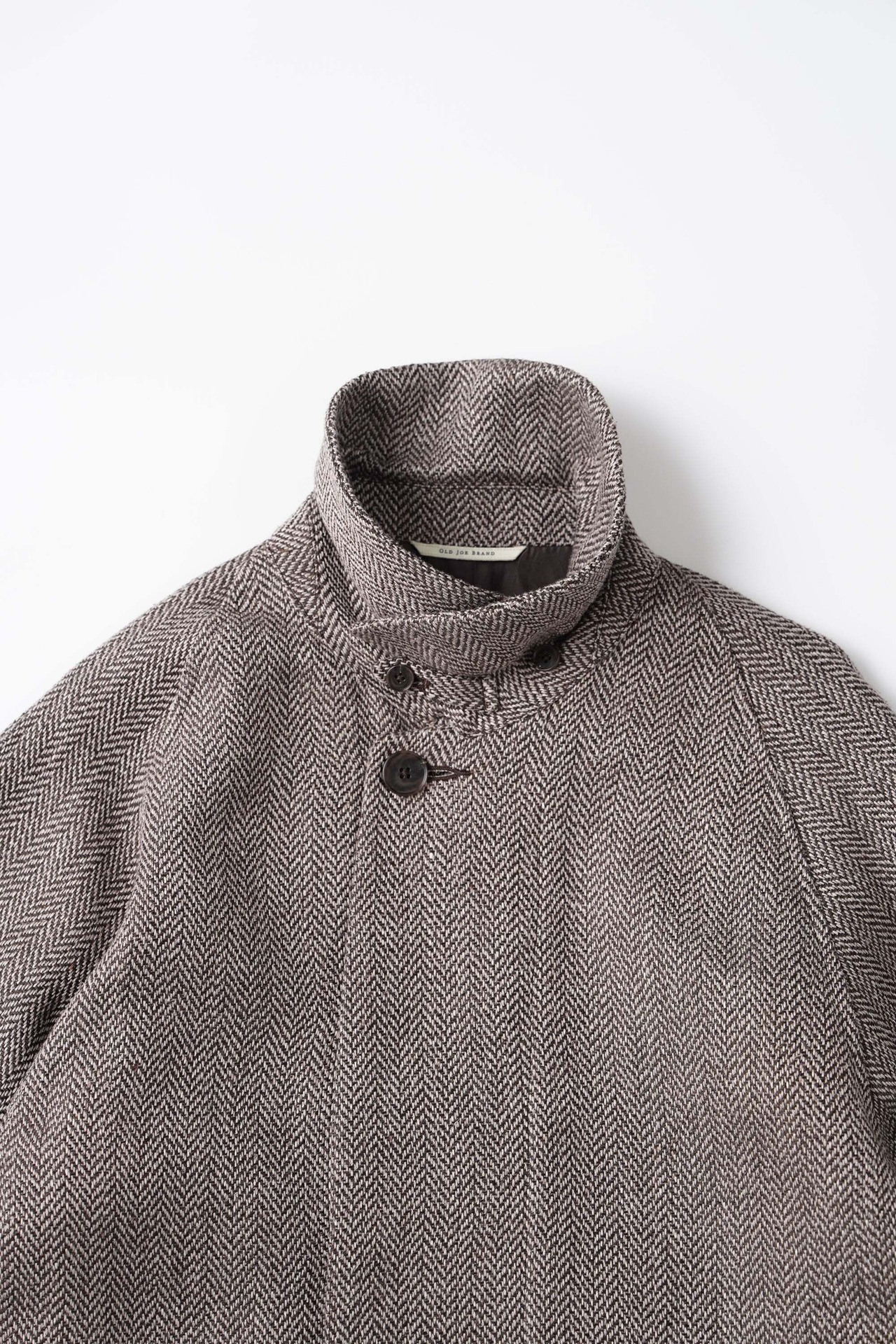 ざっくりとしたAラインシルエットと美しくカーブを描いた襟が、古き良き存在感を醸し出す。